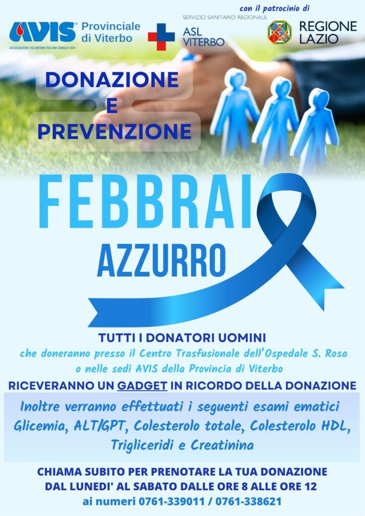 Anche quest’anno 𝐀𝐕𝐈𝐒 𝐏𝐫𝐨𝐯𝐢𝐧𝐜𝐢𝐚𝐥𝐞 𝐝𝐢 𝐕𝐢𝐭𝐞𝐫𝐛𝐨 aderisce alla campagna di prevenzione promossa dalla 𝐀𝐒𝐋 𝐝𝐢 𝐕𝐢𝐭𝐞𝐫𝐛𝐨 “𝐹𝑒𝑏𝑏𝑟𝑎𝑖𝑜 𝐴𝑧𝑧𝑢𝑟𝑟𝑜”, iniziativa dedicata alla salute e alla prevenzione per i donatori di sesso maschile.